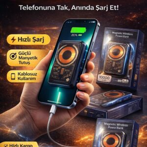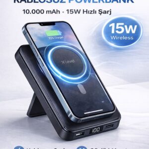 Manyetik kablosuz powerbank ile telefonunuzu hızlı ve pratik şekilde şarj edin, stand özelliği ile konforu artırın.