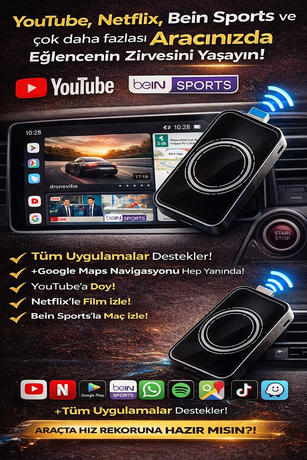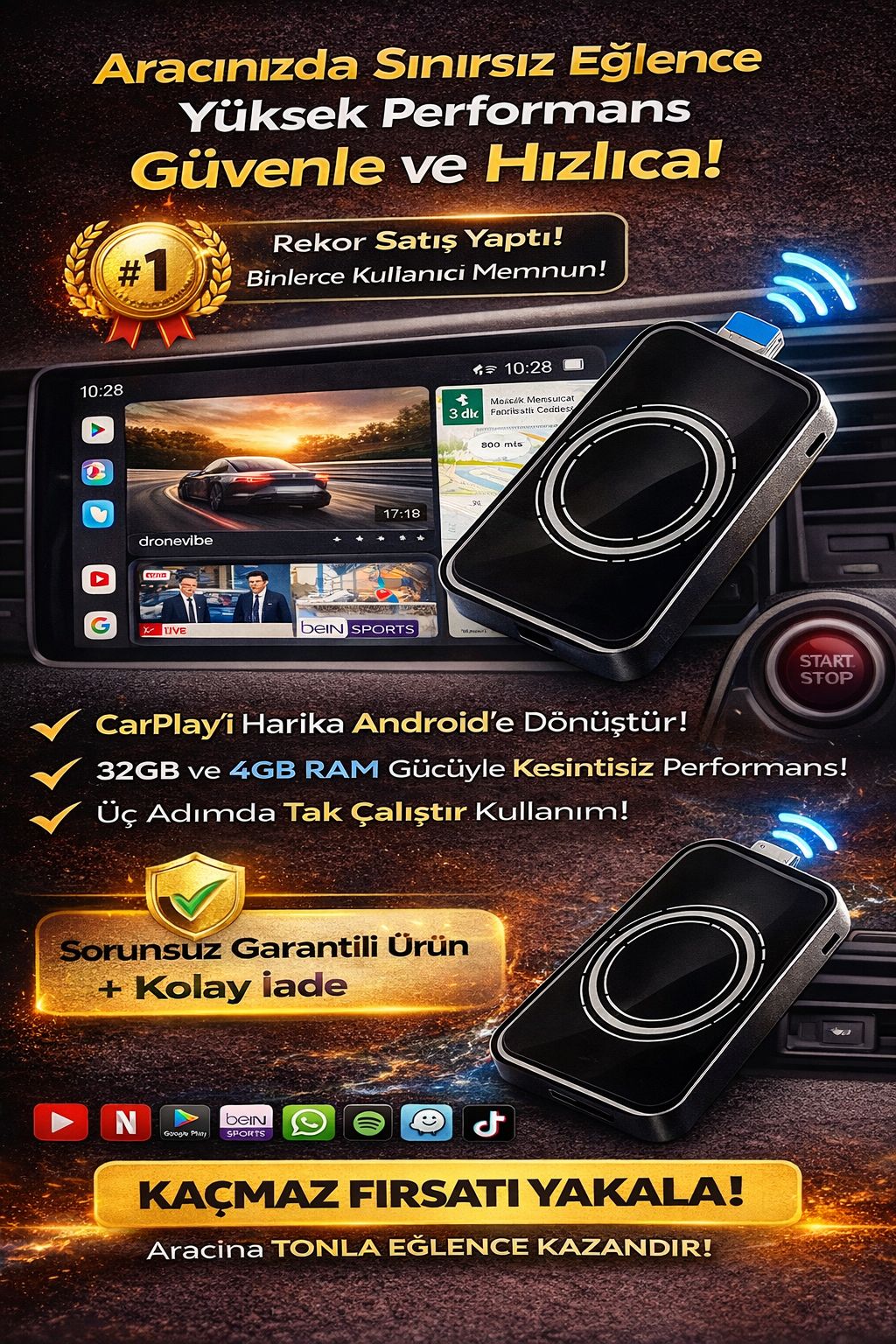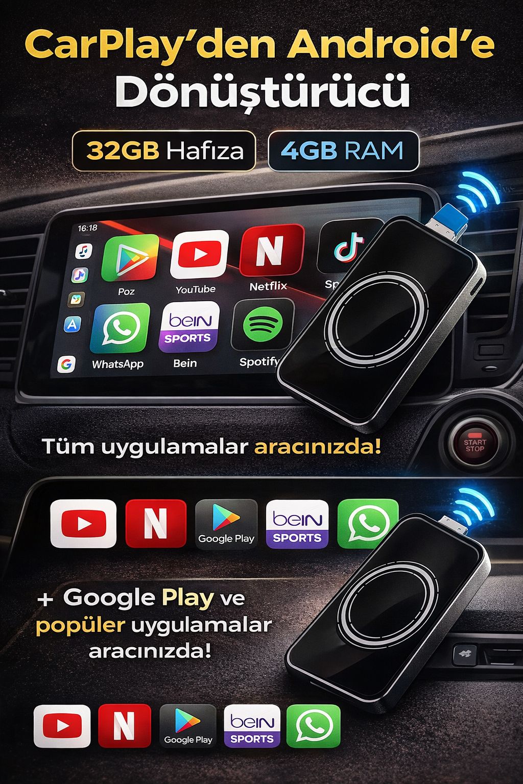 CarPlay Android dönüştürücü ile aracınızın ekranını akıllı multimedya sisteme çevirin! 32GB hafıza ve 4GB RAM gücü sayesinde YouTube, Netflix, Spotify, WhatsApp ve Google Play gibi popüler uygulamaları aracınızda sorunsuz kullanabilirsiniz. Araç multimedya box özelliği ile CarPlay destekli ekranınızı Android sisteme dönüştürerek sınırsız eğlence ve kullanım imkanı sunar. Kablosuz bağlantı desteği sayesinde pratik kurulum sağlar, ekstra işlem gerektirmez. Araç içi Android box, uzun yolculuklarda film izleme, müzik dinleme ve navigasyon kullanımını kolaylaştırır. Tüm uygulamaları aracınızda kullanabileceğiniz bu cihaz, araç teknolojisini bir üst seviyeye taşır. CarPlay dönüştürücü, Android auto box, araç multimedya cihazı ve araç içi eğlence sistemi olarak çok amaçlı kullanım sunar. Kompakt tasarımı ile kolay taşınır ve tüm CarPlay destekli araçlarla uyumludur. Araç ekranını Android’e çeviren en pratik ve güçlü çözümlerden biridir!