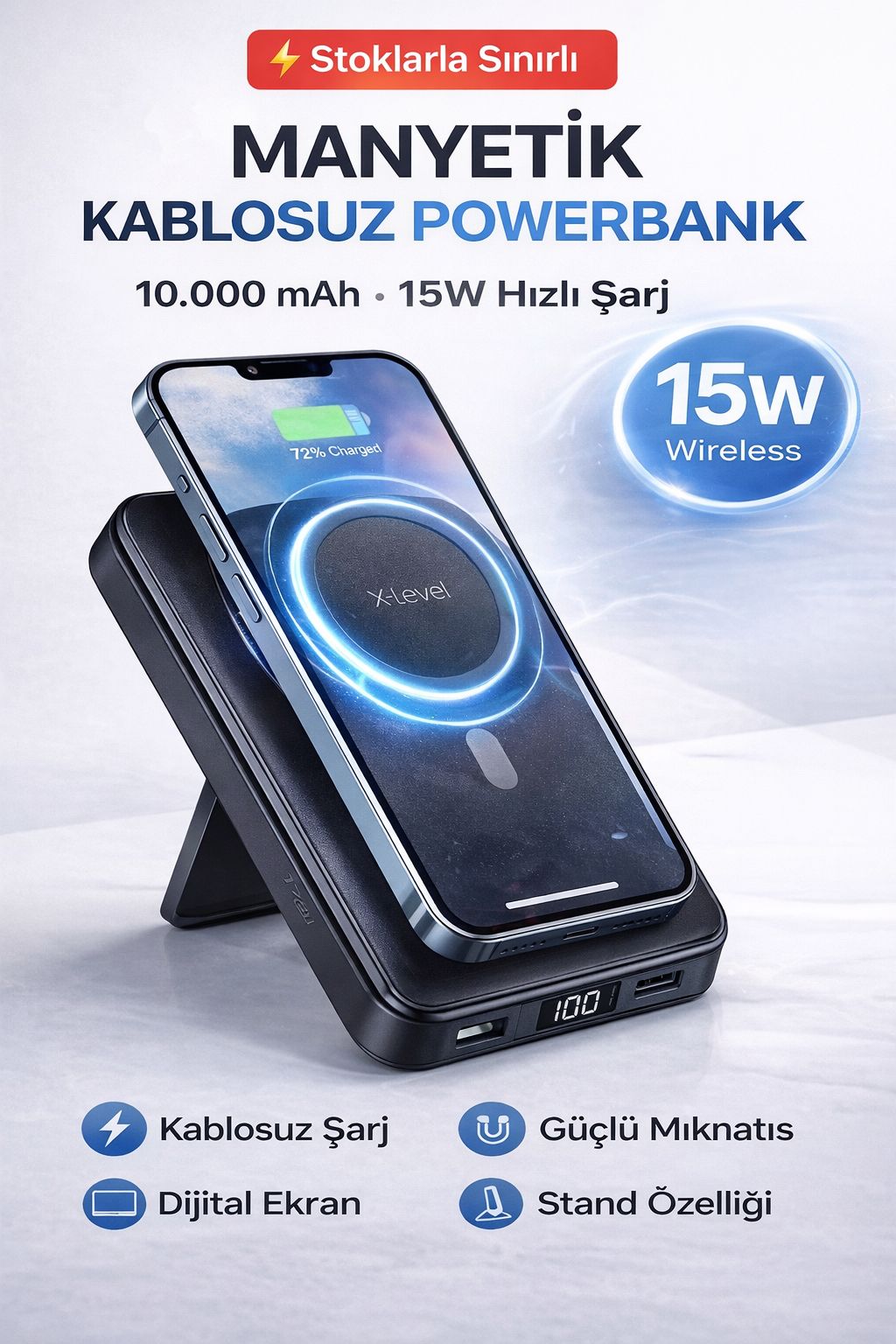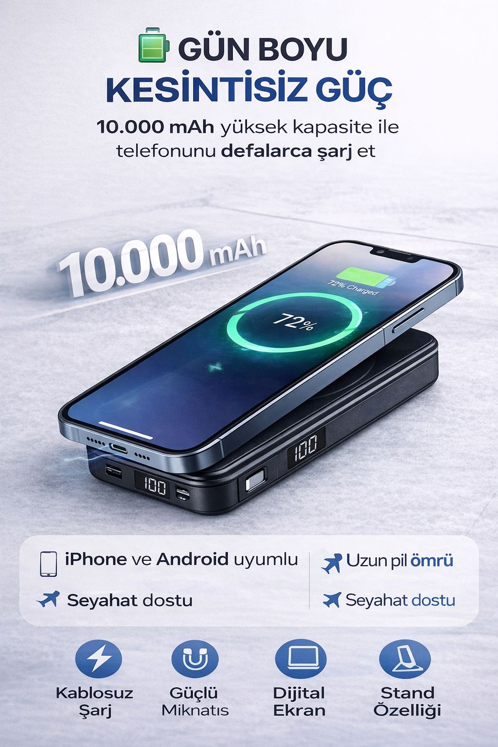 Manyetik kablosuz powerbank ile telefonunuzu kablo derdi olmadan hızlı ve pratik şekilde şarj edin. 10.000 mAh kapasitesi sayesinde gün boyu kesintisiz enerji sağlar.