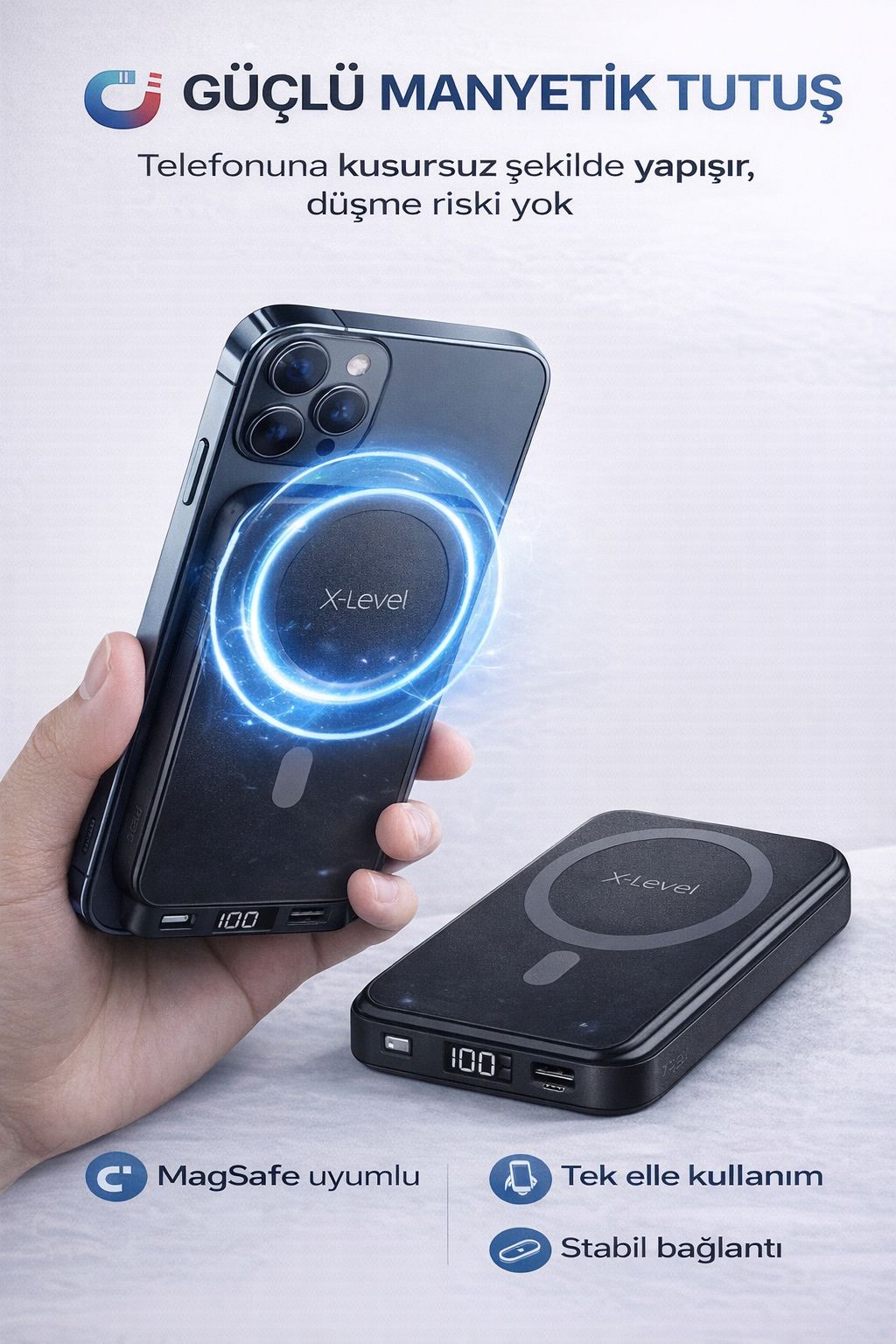 Güçlü mıknatıs teknolojisi ile telefonunuza kolayca tutunur ve sabit şekilde şarj eder. Özellikle MagSafe uyumlu cihazlar için mükemmel kullanım sunar.