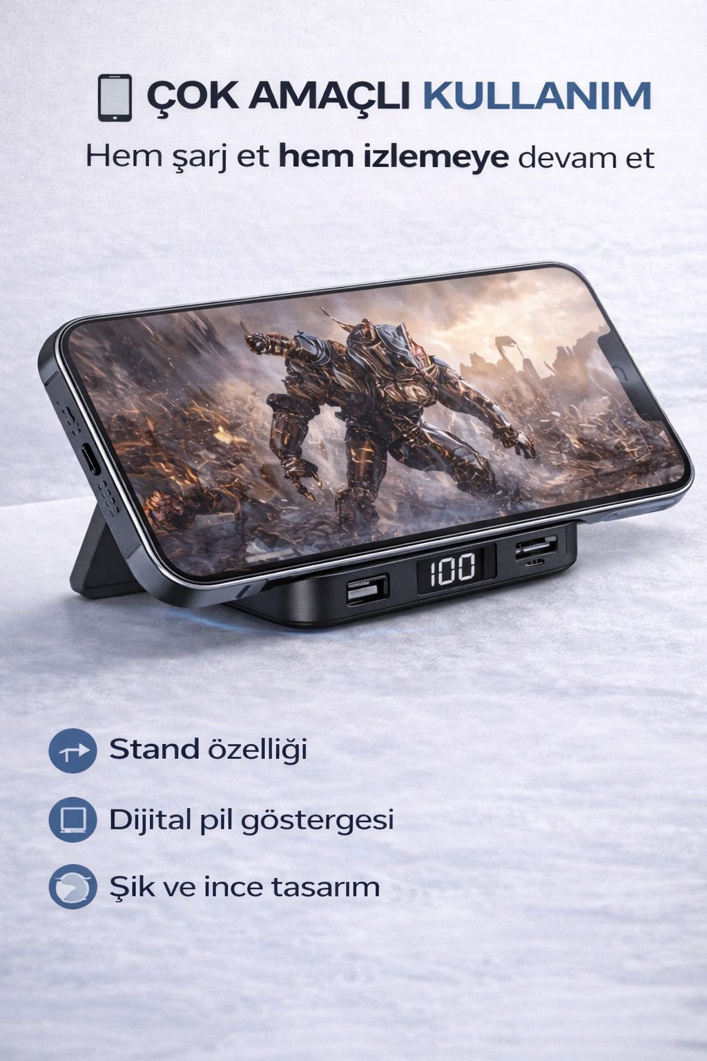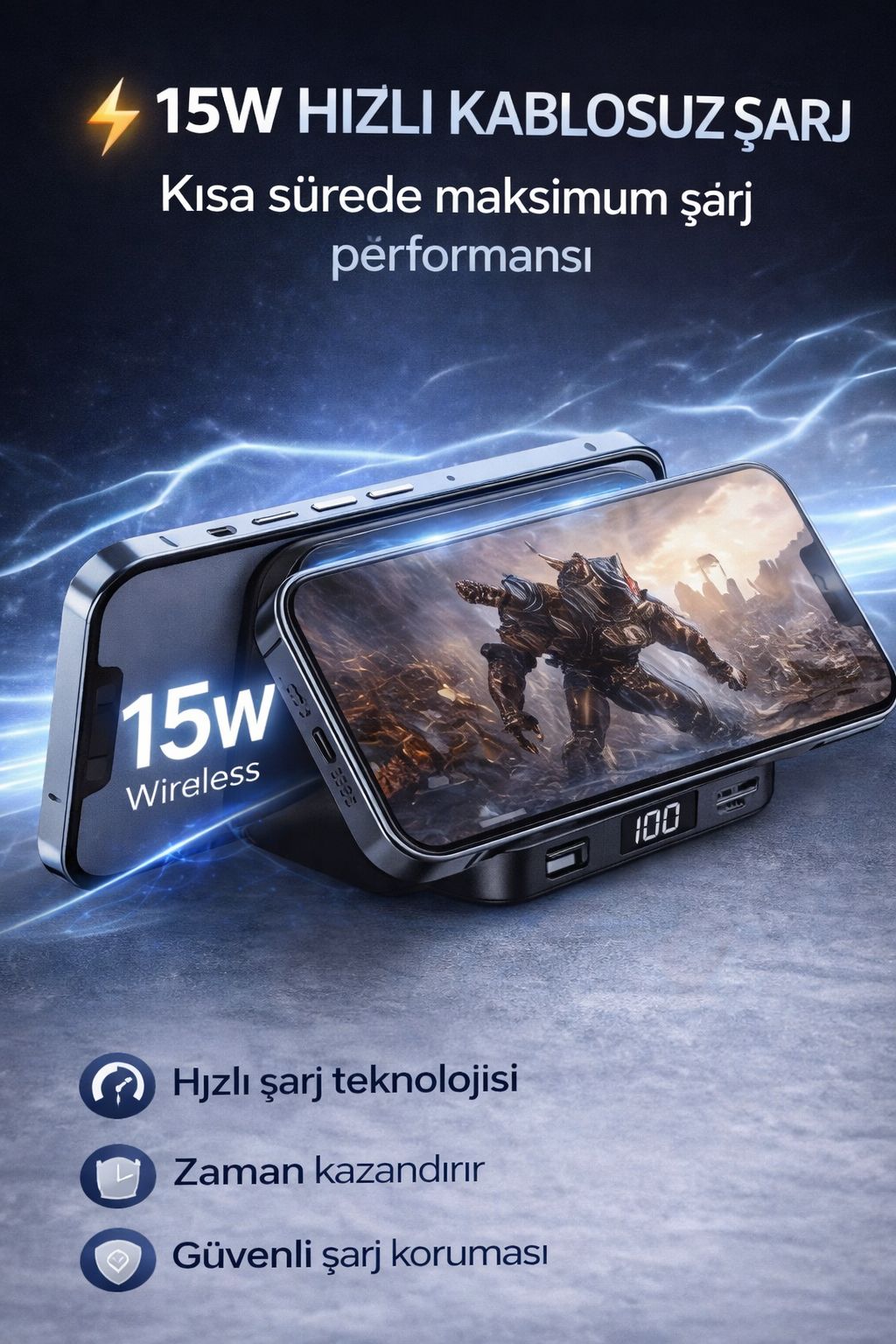 15W hızlı kablosuz şarj desteği ile cihazınızı kısa sürede şarj eder. Aynı zamanda kablolu şarj seçeneği ile farklı cihazlarla da uyumludur.
