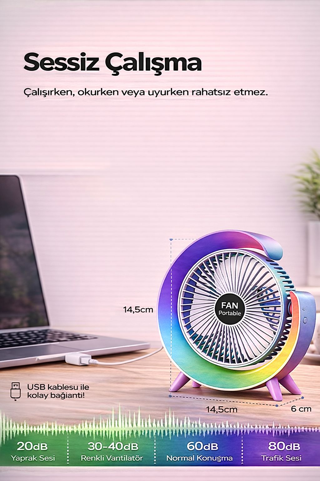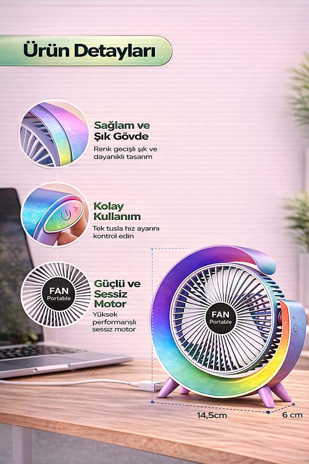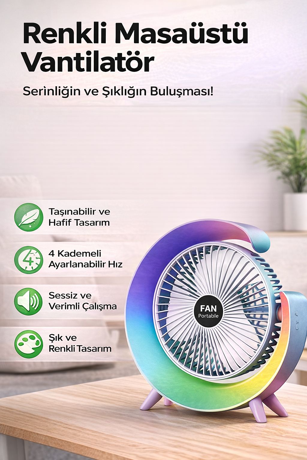 Renkli masaüstü vantilatör, şık ve modern tasarımı ile hem serinlik hem dekoratif görünüm sunan taşınabilir mini fan modelidir. USB şarjlı vantilatör özelliği sayesinde bilgisayar, powerbank ve adaptör ile kolayca kullanılabilir. 4 kademeli hız ayarlı fan yapısı ile ihtiyacınıza göre hava akışını kontrol edebilirsiniz. Sessiz çalışan mini fan, ofis, ev, çalışma masası ve yatak odasında rahatsız etmeden kullanım sağlar. Taşınabilir vantilatör kompakt ve hafif tasarımı sayesinde kolayca taşınabilir ve her ortamda kullanılabilir. Güçlü hava akışı sağlayan masa fanı, sıcak yaz günlerinde hızlı serinlik sunar. Renkli vantilatör tasarımı ile estetik görünüm sunarak masa dekorasyonuna katkı sağlar. USB fan, mini vantilatör, sessiz vantilatör ve masaüstü fan arayan kullanıcılar için en çok tercih edilen ürünler arasında yer alır. Fiyat performans vantilatör kategorisinde öne çıkan modellerden biridir.